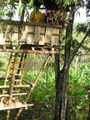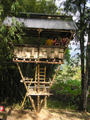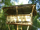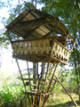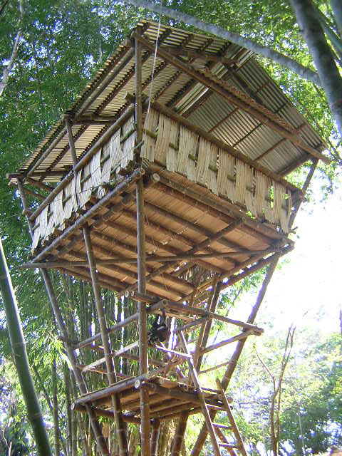 The hooch, the largest to date, 12' by 12', will serve as a wildlife observatory, and for occasional sleepouts for students in the tropical studies program at Pitzer College. The grounds are those of the Firestone Center for Restorative Ecology and the result of a collaboration of Pitzer College and Dianne Firestone.