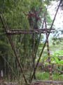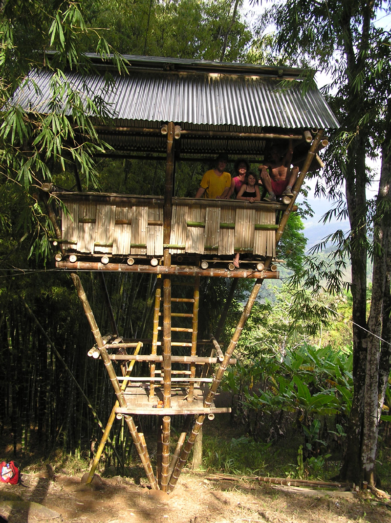 The site selected was on the upper edge of a large bamboo plantation of guadua and Dendrocalamus asper bamboo- from which the materials for the hooch were harvested and preserved with a pressurized borax solution. The view from the site looks over banana plantation to a mountain panorama. Through the rainforest to the West, the Pacific ocean can be seen. While building, we were visited by a troupe of monkeys who peered over the treetops to check out us and the hooch. Toucans, and various other animals I have never seen or even heard of also visited.