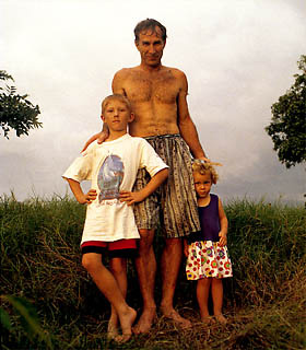 Laura had her landscaping business on St John, and I did my bamboo work, making everything from lamps to complete bars and store interiors. Our love of plants was somewhat hindered by the liveaboard lifestyle, we could not grow. So, it was a natural evolution to finally realize our need of land, and end our life on the water. ![]() The soon to be additional crew member was also a factor in our decision, and, after some false starts, and some investigation, we settled in Rincon', a small surfing town on the Western tip of Puerto Rico. Here was the land, the soil, the rain, and the sunsets. Though the cultural and language barriers of this decidedly latin island were formidable, we soon fell into the local scene, a scene not without a sizeable contingent of continentals-surfers, retirees, and a few other St. John refugees. The search for land, an almost daily task involving bicycle treks throughout the Atalaya peninsula, was disappointing. Most houses were of the Puerto Rican genre, cement mausoleums with bars over the few windows, small, airless rooms, and all situated close together on the road. Having lived in St John, with a tremendous variety of open air architecture, and the quaint traditional, West indian cottages, we were not at all impressed with this "style". It became apparent we would have to build, but where. I thought I had biked every road there was, but, backtracking sometimes, I'd find something else. Finally, I found a road of unbelievably rural quality, with few houses, views of the ocean, and bikeably close to the beaches. As I coasted down a hill, I noticed an overgrown path/road, closed off long ago. I came back to it, maneuvered through the barbed wire, and followed the path to a grove of ancient mango trees, two giant genip trees, and a ruined foundation in the center. This, I thought, this is it. It was so magical, so heavy with a sense of place, I knew I had found my place. The porch stood in almost perfect repose, its moulded concrete flower pots peaking through the overgrown foliage. It was of the 50's vintage, when Puerto Rico was in the midst of operation bootstrap, an economic program that included bringing affordable housing to the populace. A classic example of the classic houses of that era, before iron bars and flat, leaky roofs that eventually became ubiquitous. I did my research, and it was indeed for sale. The old farmer who had lived here, who had finally died at the age of 92, had had his final event the year before. His kids didn't want the land, and I did. Long ago, the land was sugar cane, supporting numerous families along the ridge, in near poverty. Then, when sugar prices fell in the 50's, most everyone moved to New York City. The land then reverted to cattle, and finally went fallow for the better part of 15 years. When I arrived, the almost 12 acres was covered in vines, impenetrable, and seemingly in dire need of attention. The road had been a foot path in the 50's, and another footpath went along the ridge and passed the old foundation. That was in 1992. In the next seven years, we raised our new family, built our "Tropical Treehouse", landscaped the land, and sold our boat. It has been a labor of love, the culmination of every day-dreamed idea, and a fine place to grow up, for all of us. As I worked the land, I collected the evidence of the old mans' longevity, placed alongside tree trunks and rocks- his beer bottles and Phillips milk of magnesia. We found old shoes, chamber pots, perfume bottles, and door hinges, the remnants of a bygone era. We found royal pams, sour orange, sweet orange, African tulip trees, flamboyan trees, all struggling to exceed the grasp of the vines. They did, finally, with our help, and now stretch for the sky. We planted hundreds of native Puerto Rican hardwoods, fruit trees, bananas, and of course, twenty some species of bamboo. I dammed the quebrada (intermittent stream), and now have waterfalls after our periodic gulley washers. We experienced three hurricanes here, the last of which, Georges, was the true test. We survived, and though we lost many trees and bamboo, you would not know it today, such is the regenerative power of the tropics. The house, and, most happily, my bamboo hooch, stood almost unscathed, though the contortions I witnessed as the storm buffeted the hooch, wore heavy on my confidence. My family now has opted for a sabbatical, a taste of the North. Sophia has not seen snow, and Sam and I would like to try snowboarding. So, though it is difficult to leave this lovely valley, we are doing it. We will return, but for now, our home is available for other like minded people, and we would be happy to spread the wealth. | |